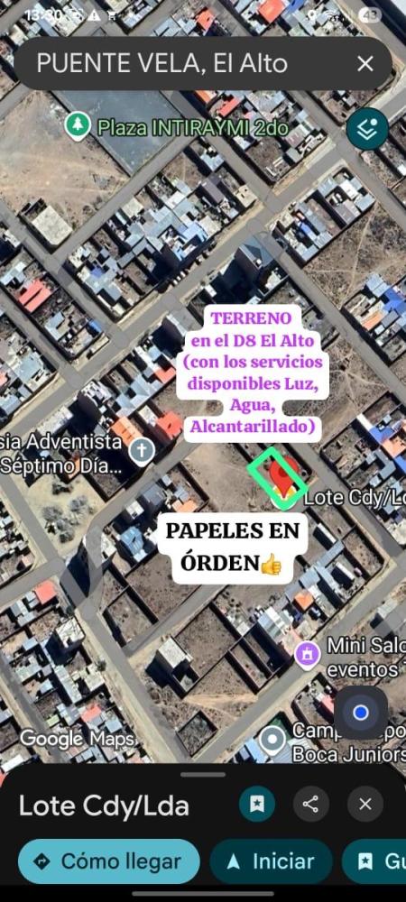 🏡 ¡Oportunidad de Inversión en El Alto – Distrito 8! 🏡 📍 Urbanización Santísima Trinidad, a solo 7 cuadras del Puente Vela. Terreno con dos salidas directas por avenida hacia la carretera Oruro y Viacha, ideal para vivienda o proyecto comercial. ✨ Características: * Superficie: 266 m² * Todos los servicios básicos (luz, agua y alcantarillado) * Ubicación estratégica con alto potencial de crecimiento * Documentación al día 💰 Precio: $49,000 (T/C 7) (Monto ajustable según el nuevo tipo de cambio oficial) 📞 ¡No dejes pasar esta excelente oportunidad! Contáctame para más información o coordinar una visita.