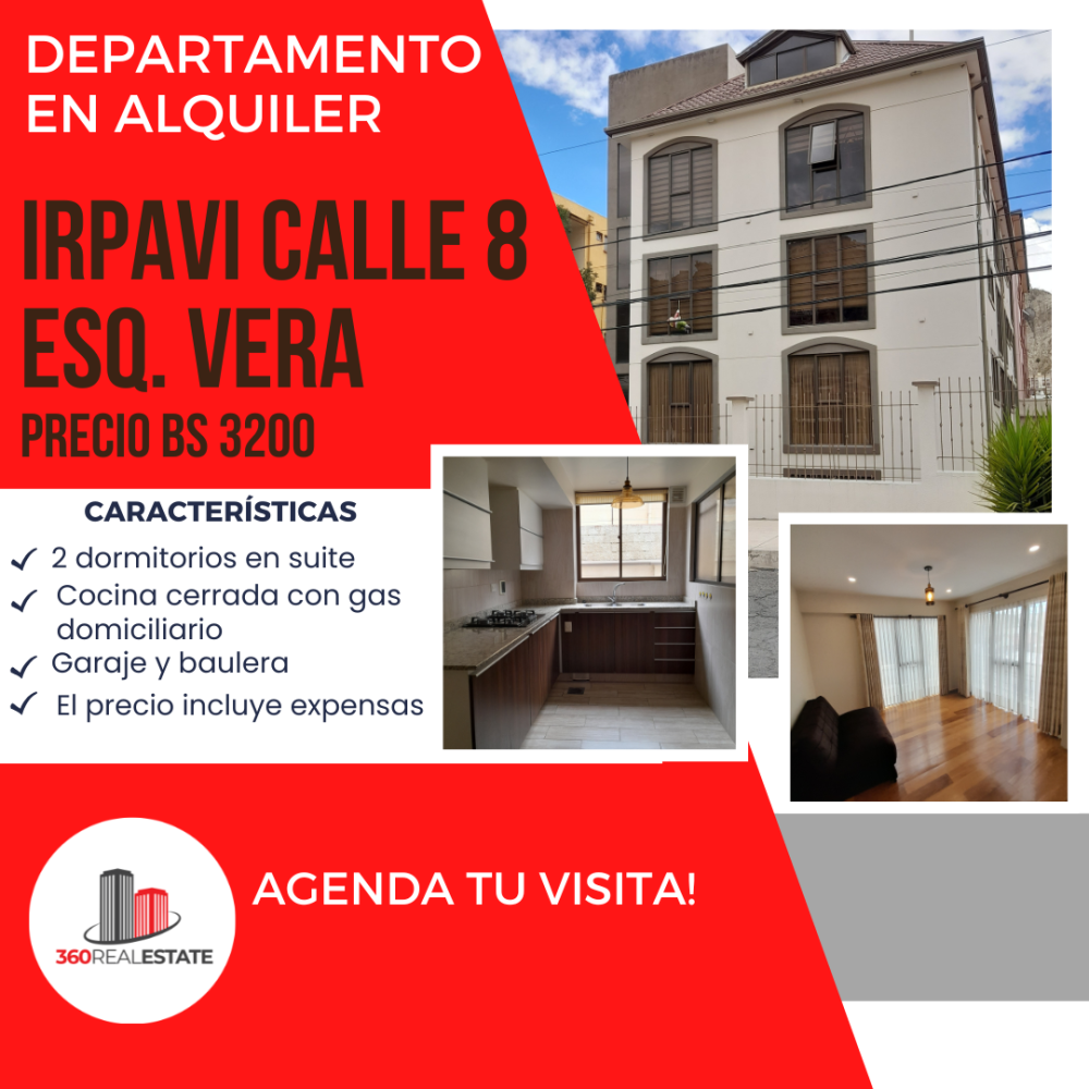 HERMOSO DEPARTAMENTO EN ALQUILER EN IRPAVI Calle 8 Esq. Av. Vera 94m2 de superficie 2 dormitorios en Suite 3 baños Cocina cerrada con cajonería alta y baja y cocina encimera Garaje y baulera Alquiler Bs. 3.200 Incluye expensas Un mes de garantía Comisión inmobiliaria